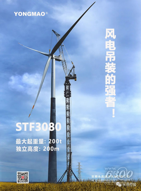 永茂STF3080风电快装动臂塔机,其独立吊装最大高度为200米,最大起重量为200吨,解决了当前高度160米以上大吨位风力发电机组安装缺少吊装设备的施工难题,为风电行业向高度更高、容量更大发展提供了设备保障。