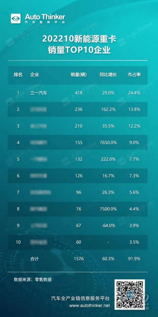 根据汽车智库平台最新数据显示,10月,三一新能源重卡以418台的销量,市占率达24.4%,再次蝉联新能源重卡全国月销量冠军。