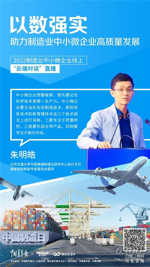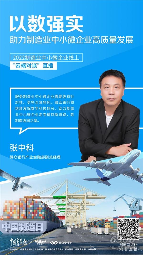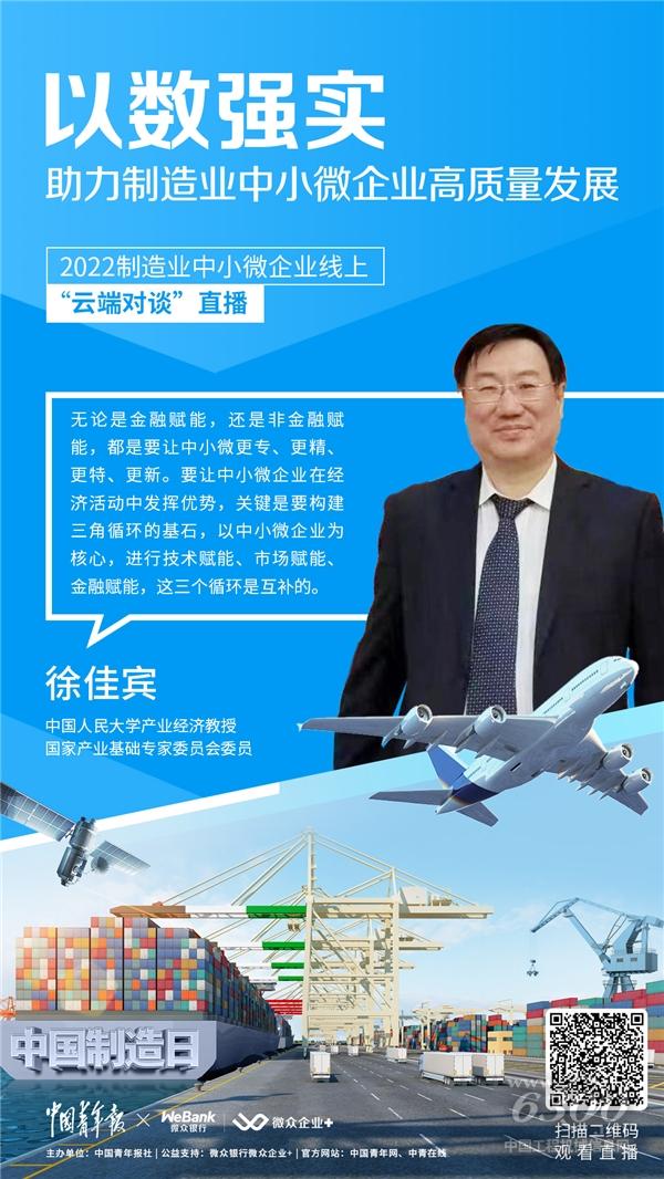 2022年12月26日是第七届“中国制造日”。这一天,世界舞台属于“中国制造”。高铁、新能源成为中国制造“金名片”,卡塔尔世界杯足球场成为中国制造“扬帆出海”的又一站,首架C919成功交付划下航空工业“里程碑”……中国制造作为立国之本、兴国之器、强国之基,勇攀新高离不开大国工匠的精益求精,也不止来自链主企业、领军企业的追求卓越,“小而美”的专精特新中小微企业和无数科技创新企业,也为制造强国夯实基础。为助力更多制造业中小微企业走高质量发展道路,微众银行联合中国青年报社开展2022制造业中小微企业线上“云端对谈”直播,以“以数强实 助力制造业中小微企业高质量发展”为主题,邀请中国人民大学产业经济教授、国家产业基础专家委员会委员徐佳宾,北京交通大学中国高端制造业研究中心执行主任、国家智能制造专家委员会委员朱明皓,广东省佛山市顺德区科学技术局金融工作局金融发展科副科长周广财,微众银行产业金融部副总经理张中科,以及制造业企业家代表——深圳市中扬数控机床有限公司联合创始人、副总经理李再兴展开深入探讨,解读中小微制造企业的政策举措,帮扶中小微制造企业纾困解难,促进中小微制造企业为推动经济社会发展贡献更强大的动能。