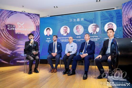从左到右:泵友圈新媒体主编沈庆春,格兰富系统产品高级总监奥克森(Peter Vestergren Åkesen,上海建筑设计研究院总工程师朱学锦、格兰富商业建筑事业部中国区总经理方勇、上海赢展流体设备有限公司总经理邹士银