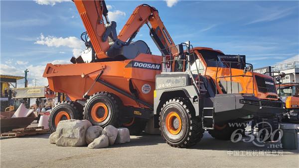 展会现场展示的挖掘机及铰接式自卸卡车产品