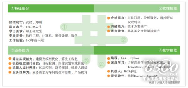除了企业急需的人才类型和关键岗位,《报告》还创新推出“井”型数字人才的概念,为智能制造行业关键数字人才提供胜任力模型,帮助智能制造企业破解人才供需不能精准匹配的难题。以智能制造领域的“算法工程师”岗为例,其胜任力模型如下:一是基本特征,包含专业背景、工作经验、分布城市、薪酬水平;二是软性技能,包括定位问题、分析数据能力,技术方案推广的沟通能力以及具备英文文献阅读的预言能力;三是业务能力,例如建模及模型优化能力等;四是数字能力,包括掌握C++、Python语言编程能力以及了解深度学习算法或框架等。