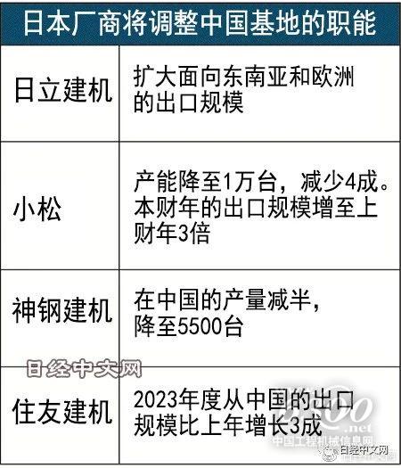 随着三一重工等中国当地厂商在提高基础性能的同时展开价格攻势,2000年代曾达到两位数的小松和日立建机的在中国市场份额分别降至数个百分点。两家企业面向中国市场的生产设备变得过剩。不过,中国的生产在原材料和人工费方面具有竞争力,而且日本的零部件厂商已经进驻中国,容易采购零部件。在此背景下,把面向中国的产能转为用于出口的趋势正在加强。
