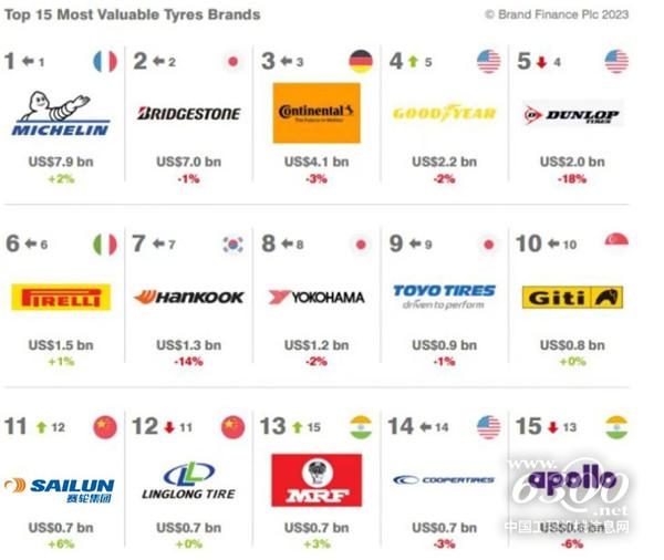 近日,英国品牌评估机构“品牌金融”(Brand Finance)发布“2023全球轮胎品牌价值15强”(Tyres 15 2023)榜单。
