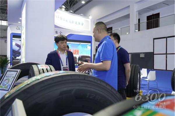 参会嘉宾——老挝国家工商总会首席驻华代表到展馆交流,贵州轮胎党委副书记、总经理王鹍向其详细介绍公司数字化发展情况及市场创新产品。