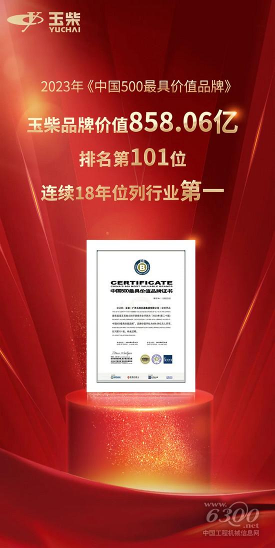 今天,由世界品牌实验室主办的(第二十届)“世界品牌大会”在北京举行,会上发布了2023年“中国500最具价值品牌”分析报告和排行榜。在这份基于财务数据、品牌强度和消费者行为分析的年度报告中,玉柴品牌价值跃升至858.06亿元,位居榜单第101位,连续18年领跑内燃机行业。
