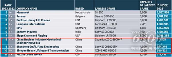 排名前七的公司的排名与去年相同,是迄今为止世界上最大的国际重型起重和运输专家。常年领先的玛姆特(Mammoet)与最接近的竞争对手萨伦斯(Sarens)之间的差距也比去年小。去年的差距为837946,而今年的差距为646318,比去年减少了23%。所以,榜单的第一个变化是,中核机械工程有限公司排名上升了两位,取代了美国的马克西姆公司,排名第八;中国企业的山东海湾吊装工程股份有限公司保持了去年的第9名;中石化重型起重运输工程有限责任公司从第11名进入前十。