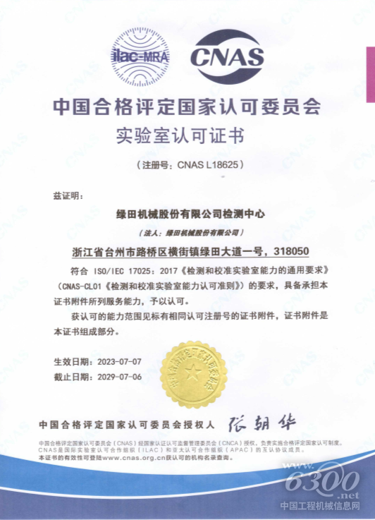 近日,绿田机械股份有限公司研发测试中心-检测实验室取得了中国合格评定国家认可委员会(CNAS)颁布的实验室认可证书。