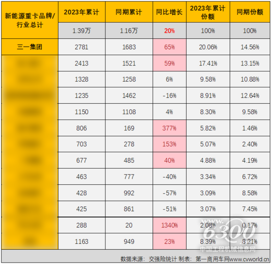 从市场份额看,2023年1-7月,三一新能源重卡累销2781辆列行业首位,累计份额达到20.06%,是唯一一家累计份额超过20%的企业,较上年同期提升5.51个百分点。