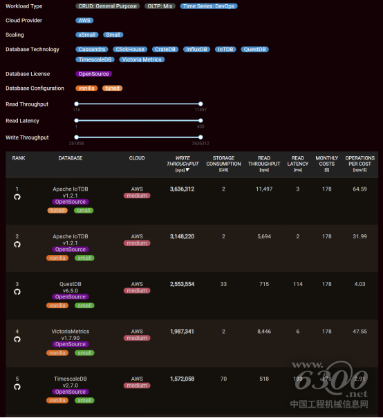 测试机构 benchANT 位于德国,专门进行云设施和数据库性能的评估。鉴于用户对数据库选型时,很难找到参考基准以衡量数据库的性能与功能,benchANT 致力于在统一的硬件资源和系统配置下对各类主流数据库系统做性能测试,并依据各项指标进行排名。其时序数据库排行榜的评估标准是基于 TSBS 基准测试套件的 DevOps 场景,在统一的 AWS(Amazon Web Services,是亚马逊公司提供的一套云计算服务)环境中进行测试,并比对性能结果。