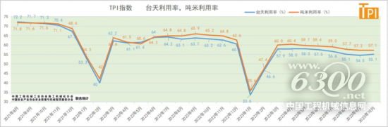 10月份塔机利用率略高于9月份,台天利用率55.1%,比上月高0.6个百分点,比去年同期低8.1个百分点;最大起重力矩利用率57.1%,比上月低0.1个百分点,比去年同期低8.1个百分点。