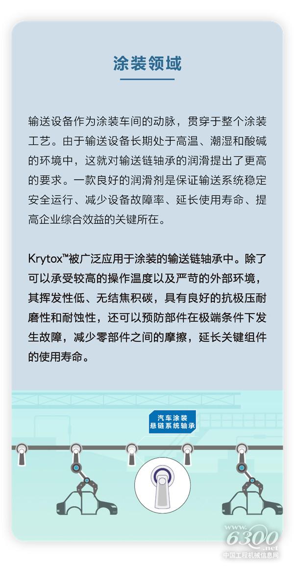 此外,使用科慕Krytox™高性能润滑剂还可以提高效率,减少润滑剂的使用,延长设备和轴承的使用寿命,大幅降低自然资源的消耗量,为经营者提供更高的成本效益,助力用户实现可持续发展。凭借科慕在工业设备润滑领域深耕数十年的丰富经验,Krytox™已成为众多设备管理者长期信赖的“润滑专家”。