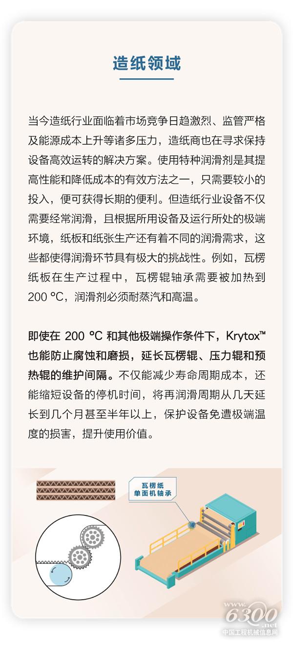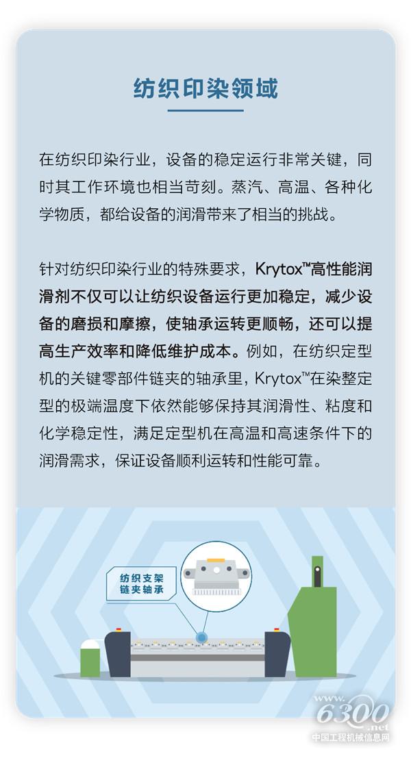 实践证明,Krytox™高性能润滑剂可有效减少零部件故障和设备的停机时间,显著延长设备使用寿命,并通过缩短再润滑周期,全面助力包括纺织、造纸、汽车、食品、电子和半导体等在内的多种现代工业可持续发展和提升。