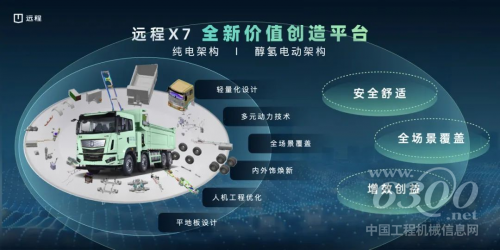 聚焦市场及用户的实际需求,远程基于纯电架构创新突破,打造醇氢电动架构,可满足各类场景下的续航要求。依托该架构优势,远程打造新能源重卡全新价值平台X7,融合纯电和醇氢电动两大技术路线,适配自卸车、搅拌车、牵引车三大车型,可以满足新能源重卡全场景使用需求。