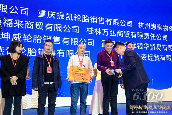 公司总工程师王海和副总经理周秩军为17家优秀合作伙伴颁发特种轮胎销售奖。