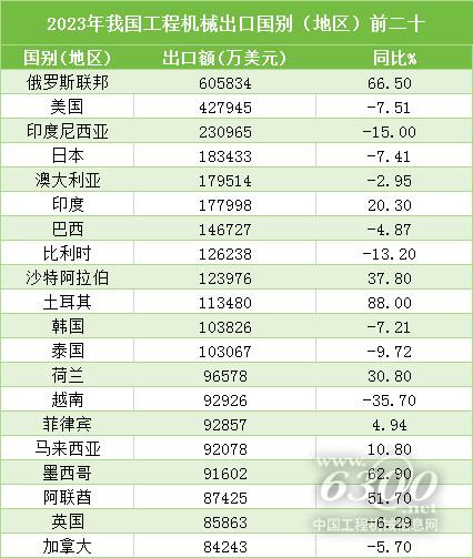 挖掘机主要出口国别有:俄罗斯、比利时、印度尼西亚、美国、土耳其、沙特阿拉伯、菲律宾、越南、英国、荷兰等,上述各国出口金额均超过2亿美元;