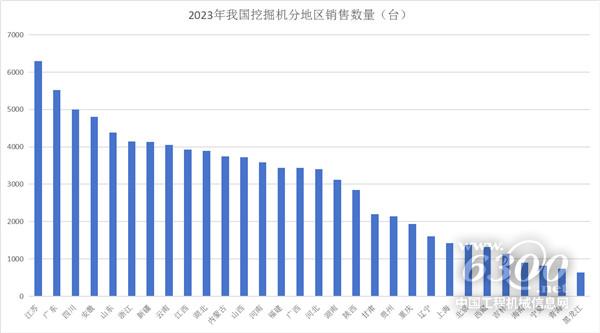 2023年,挖掘机销量前十的地区分别为:江苏、广东、四川、安徽山东、浙江、新疆、云南、江西、湖北。其中只有江苏(6294台)、广东(5520)两个省份年销量超过5000台。