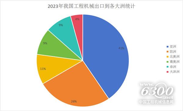 2023年我国工程机械在对各大洲的出口中,对亚洲、欧洲、南美洲、非洲出口实现了正增长,对北美洲和大洋洲出口下滑,具体情况如下: