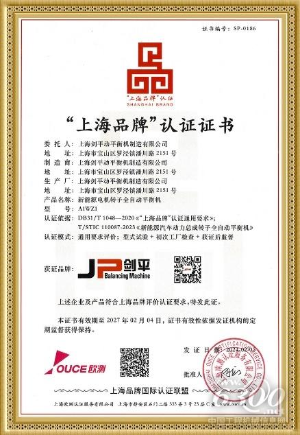 近日,上海剑平动平衡机制造有限公司凭借其卓越的产品质量和创新能力,成功荣获“上海品牌”认证证书。这不仅证明了剑平在动平衡机领域的领先地位,也体现了剑平对于产品质量的严格把控和对于技术创新的不懈追求。