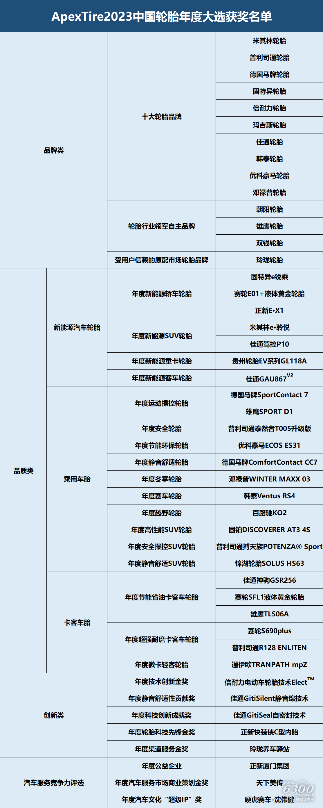 据组委会介绍,“ApexTire2023”评选活动以创新驱动、市场共赢、用户体验、行业领先、绿色发展等五大维度为品牌核心评价体系,在企业申报资格海选,第三方权威机构质量检测结果基础上,通过在车主和渠道、用户终端极具人气影响力的海选公投、专业市场调研、媒体观察评议流程,专家导师团以对评选高标准原则的坚持和底线思维的坚守,以全球视野和专业精神进行严谨科学评审,形成的线上线下大数据+智能算法产生ApexTire品牌荣誉指数,评选出“十大轮胎品牌”等行业标杆。