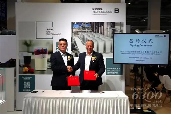 凯孚尔公司代表(右)与河北立亚包装公司代表(左)在现场举行的制杯机采购签约仪式