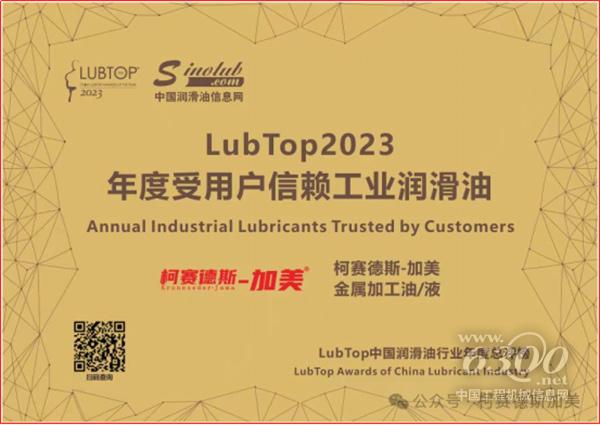 日前,受到能源行业广泛关注的LubTop2023年度总评榜于3月28日在中国上海发布,来自上海柯赛德斯加美石油集团有限公司旗下运营的“三大知名品牌”之一——柯赛德斯-加美润滑油的金属加工油/液,被总评榜授予“年度受用户信赖工业润滑油”称号。