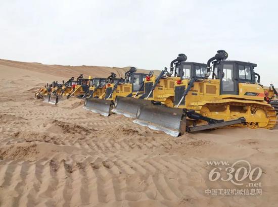 在国家“沙戈荒”大型风电光伏基地项目,气势雄伟的推土机群正在全力作业,保障项目进度。上个月,数十台柳工LD17CMLG4沙漠型推土机进驻浩瀚沙漠,这是今年柳工为该项目交付的第三批设备。目前,已有百余台柳工推土机参与到该项目中,足迹遍布广袤的“沙戈荒”。