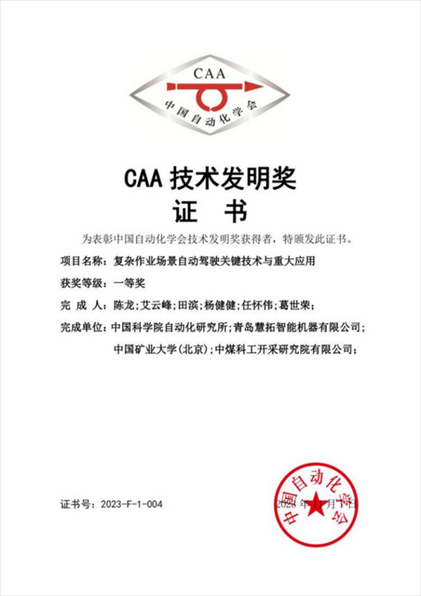 中国自动化学会技术发明奖旨在表彰在我国自动化领域运用智能、控制等科学技术知识做出产品、工艺、材料及其系统等重大技术发明的科技工作者。2023年度共评选出中国自动化学会技术发明奖一等奖6项,技术发明奖二等奖6项。其中,中科慧拓的获奖项目“复杂作业场景自动驾驶关键技术与重大应用”,主要针对复杂作业场景自动驾驶道路感知、建图和规划的关键科学技术问题与工程应用需求,开展了近十年的合作研究,重点攻克三大技术挑战,研发了面向复杂场景的道路自动驾驶感知、建图、规划关键技术与系统化产品,并实现了规模化应用。