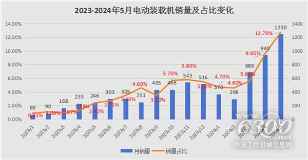 据协会数据显示:2024年5月,全行业共销售电动装载机1250台(3吨14台,5吨992台,6吨196台,7吨48台),电动化渗透率达12.72%,同比增长408.13%。电动装载机渗透率正快速提升,电动化有望成为行业增长的新动力,并正在重塑行业新格局。