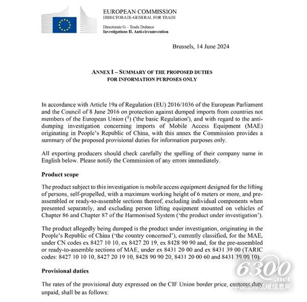 继2023年11月欧盟对中国发起的反倾销调查后。近日,欧盟公布了对中国企业生产的高空作业平台拟征收临时关税的概要,最高税率高达56.1%,超预期!欧盟委员会表示:此项临时关税旨在保护欧盟国家免受来自中国的移动式高空作业平台的倾销进口,主要针对最大高度为6米或以上的移动式高空作业平台,以及预组装或准备组装的部分进口,不包括单个部件和安装在车辆上的人员升降设备。