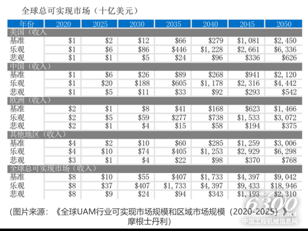 根据摩根士丹利《全球UAM行业可实现市场规模和区域市场规模(2020-2025)》:2030年,技术发展最为乐观,监管政策也能够及时放开的情况下,中国eVTOL可实现市场收入达到1880亿美元;技术成熟程度和政策配套均为中等水平时,可实现市场收入为260亿美元;而最不乐观的情况,可实现市场收入也会达到110亿美元。