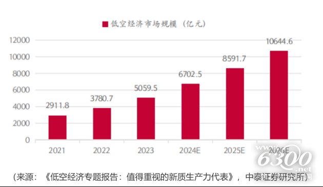 根据中泰证券《低空经济专题报告:值得重视的新质生产力代表——元年或至》:中国低空经济规模2023年超过5000亿,同比+33.8%,预估2026年有望突破万亿元,达到10644.6亿元。此外,IDEA研究院数据显示到2025年对国民经济的综合贡献值将达3-5万亿元人民币。