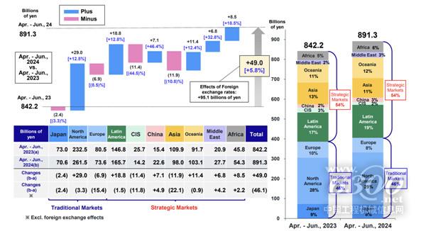 按区域看,报告期内工程机械、采矿和公用事业设备8912.3亿日元的总销售额主要由北美、拉丁美洲和大洋洲等市场贡献,而欧洲、独联体、亚洲等市场有所下降。