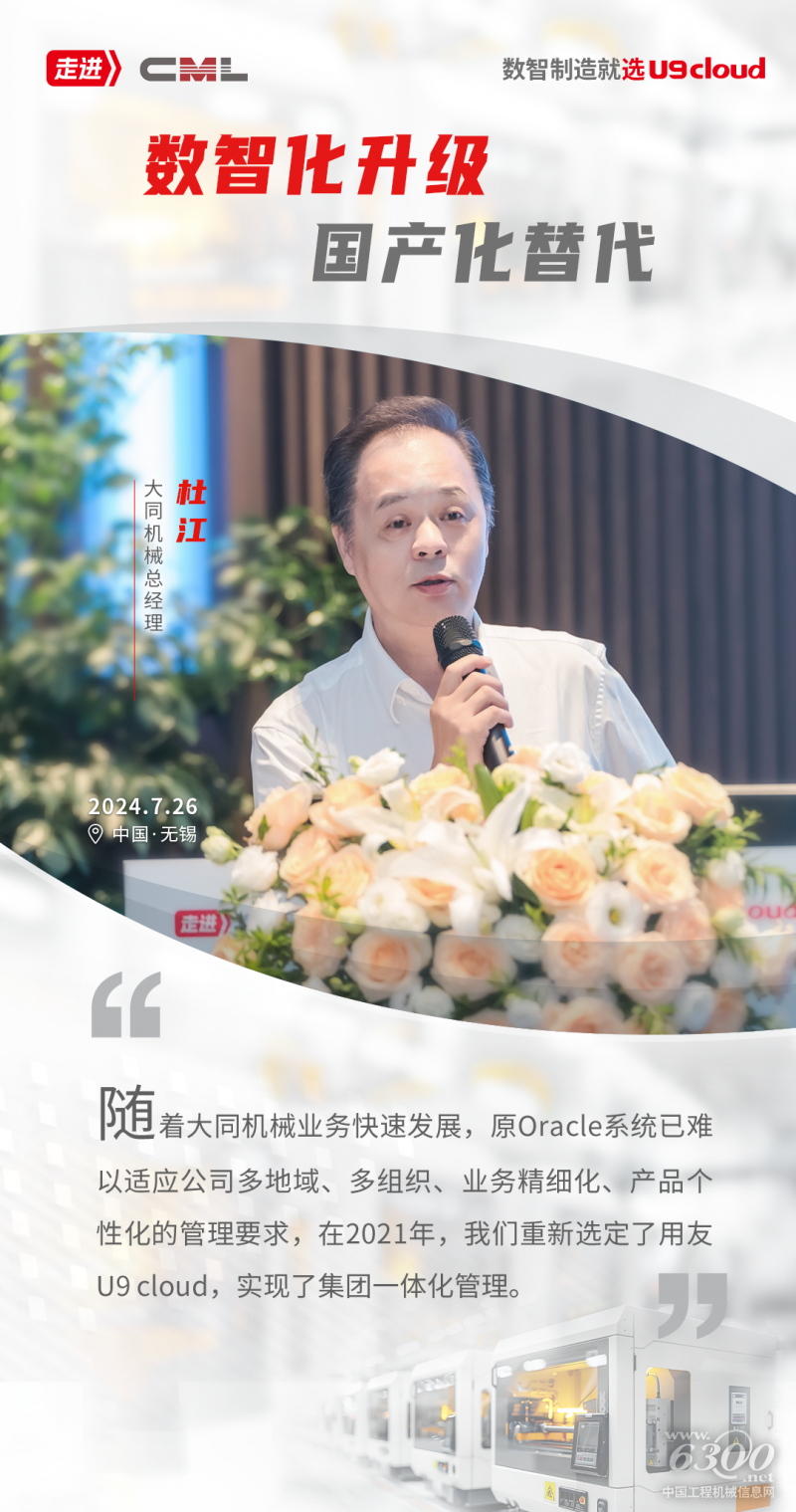 2024年7月26日,用友网络在大同机械举办了一场别开生面的数智化体验会。会上,大同机械总经理杜江先生发表了主题为“数智化升级 国产化替代”的演讲,深入分享了大同机械在数智化转型中的探索与实践成果。