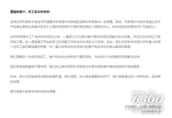 全球经济形势和本地经济环境要求利勃海尔对其地区战略和布局做出一些调整。因此,利勃海尔决定将混凝土技术产品事业部的业务集中到位于上海的利勃海尔中国区域总部这个成熟的中心。徐州地区的运营自8月1日起终止。