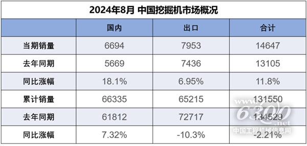 据中国工程机械工业协会对挖掘机主要制造企业统计,2024年8月销售各类挖掘机14647台,同比增长11.8%,其中:国内6694台,同比增长18.1%;出口7953台,同比增长6.95%。