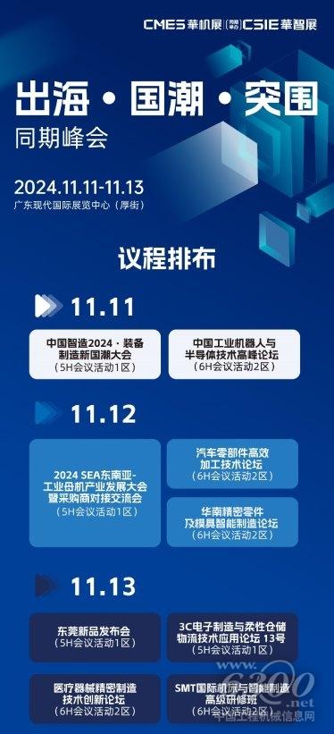 130000平展览面积、1500+国内外展商,第六届CMES华机展 | 东莞国际机床展将于2024年11月11-14日在广东现代国际展览中心(东莞厚街)举办,不仅强势集结3C电子、精密模具、汽车零部件、医疗器械应用行业的前沿设备,还将为行业敬献“1+1+N”同期峰会,暨1场超级会议——东南亚-工业母机产业发展大会、1场国潮大会、N场应用纵深论坛,打造装备智造新国潮,加速出海。