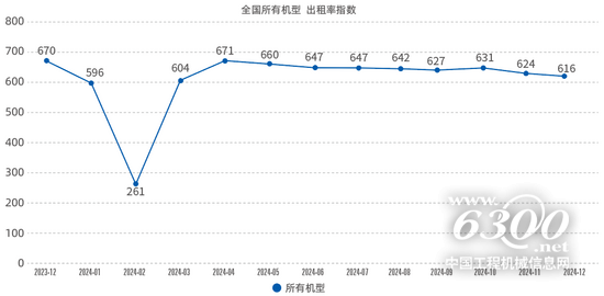 2024年12月升降工作平台出租率指数为616点,环比略降1.3%,同比下降8.1%。总体看环比出租率指数涨跌不一,其中30m以上机型出租率环比出现普涨态势,36~39m机型涨幅度最大为10.5%,而28m以下机型出租率指数环比呈下降趋势,≤6m机型降幅最大为5.9%。2024年12月出租率指数同比除40m以上机型外其他机型仍处于普遍下滑的态势,其中≤6m机型同比降幅最大为12.5%,与以往不同的是,40m以上机型出租率同环比都出现了上涨,而≤6m机型出租率指数同环比下滑幅度都最大。(出租率是以台天数为基准进行计算,100%出租率对应1000点。)