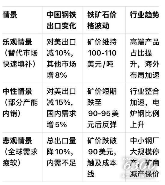 1. 短期需求波动 - 钢厂减产预期:若出口受阻导致国内钢价下跌,部分钢厂可能主动减产,短期内压制铁矿石需求。 - 库存周期调整:钢厂或推迟铁矿石补库,压低港口现货价格(如青岛港62% Fe现货价可能短期跌至90-95美元/吨)。 2. 长期结构性变化 - 区域产能转移:中国钢厂可能加大对东南亚、非洲的海外基地投资(如青山印尼园区、河钢塞钢),带动当地铁矿石需求,间接支撑全球矿价。 - 废钢替代效应:国内电炉炼钢比例可能提升,降低对铁矿石依赖(2023年中国电炉钢占比约10%,若提升至15%,年减铁矿石需求约5000万吨)。