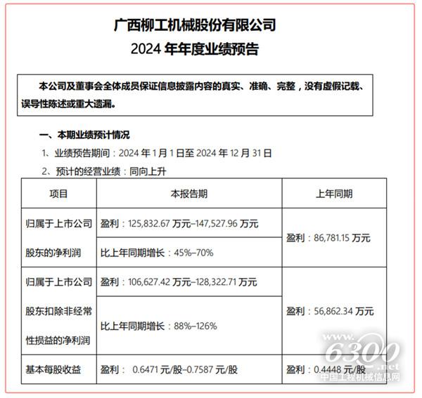 近日,广西柳工机械股份有限公司(以下简称“柳工”)发布业绩预告,预计2024年归属于上市公司股东的净利润(以下简称“净利润”)12.58亿元至14.75亿元,同比增长45%至70%。