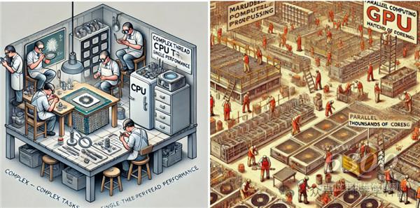 CPU 就像手艺高超但人数有限的专家团队,能独立完成各种精巧操作,却难以同时处理海量重复性工作。