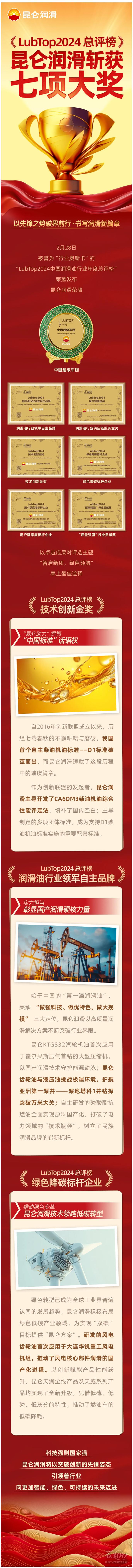 昆仑润滑斩获“LubTop2024总评榜”七项大奖