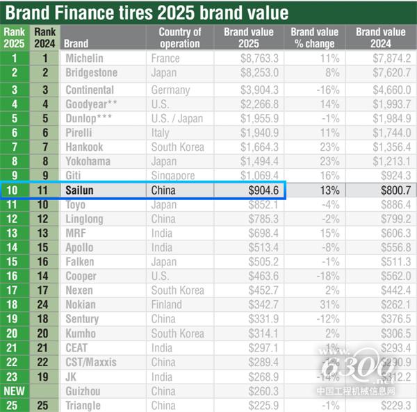 2025年5月8日,全球权威品牌评估机构Brand Finance发布了《2025全球轮胎品牌价值25强》榜单,赛轮集团首度跻身榜单前十,并再度蝉联中国最具价值轮胎品牌。