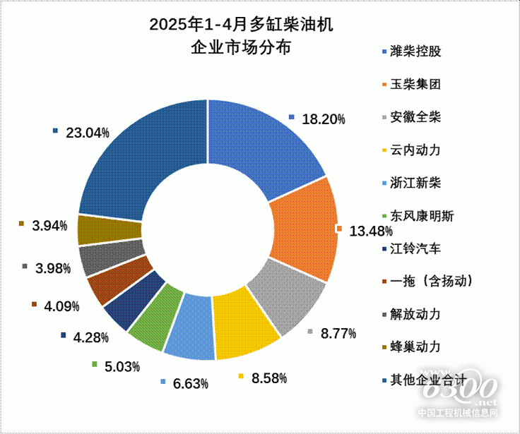 4月,多缸柴油机企业共销量38.08万台,环比增长-14.09%,同比增长3.72%;1-4月累计销量150.49万台,同比增长2.99%。潍柴、玉柴、全柴、云内、新柴、东康、江铃、一拖(含扬动)、解放动力、蜂巢动力销量居前十名,占多缸柴油机总销量的76.96%;市场份额占比中:潍柴18.20%、玉柴13.48%、全柴8.77%、云内8.58%、新柴6.63%、东康5.03%、江铃4.28%、一拖4.09%、解放动力3.98%、蜂巢动力3.94%。