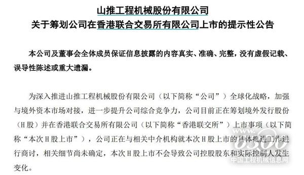5月28日盘后,山推工程机械股份有限公司发布公告称,为深入推进公司全球化战略,进一步提升公司综合竞争力,公司目前正在筹划发行H股并在香港联合交易所有限公司(以下简称“香港联交所”)上市事项(以下简称“本次H股上市”),公司正在与相关中介机构就本次H股上市的具体推进工作进行商讨,相关细节尚未确定,本次H股上市不会导致公司控股股东和实际控制人发生变化。