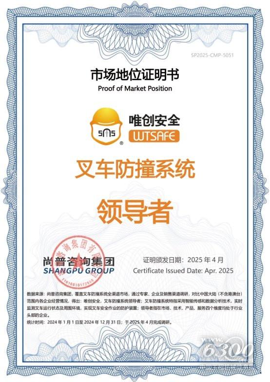 2025年4月,尚普咨询集团经全渠道市场调研,向深圳唯创安全技术有限公司的叉车防撞系统产品颁发市场地位声明书。此次唯创安全荣获尚普咨询集团【唯创安全,叉车防撞系统领导者】权威声明,表明唯创安全凭借其卓越的品质保证,赢得了市场的广泛认可。