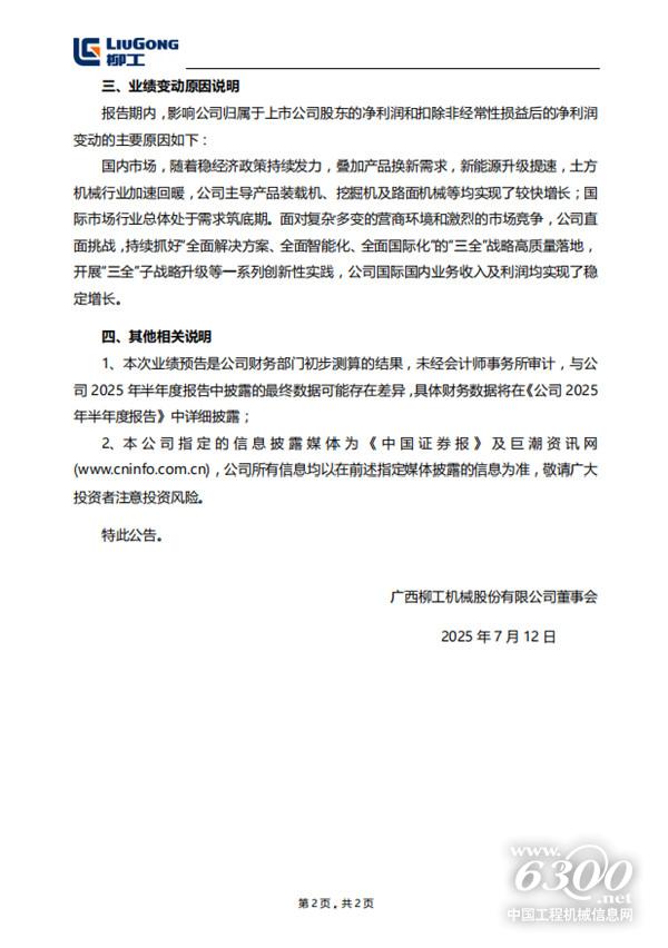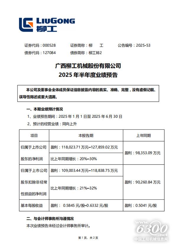 7月11日,柳工披露业绩预告,公司预计2025年上半年实现归属于上市公司股东的净利润为11.8亿元—12.79亿元,同比增长20%—30%。