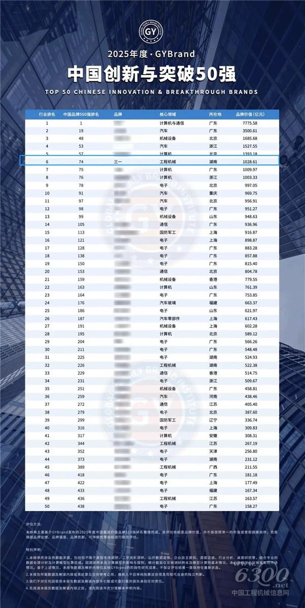 7月15日,GYBrand全球品牌研究院发布了2025年度“中国创新与突破50强”榜单。三一以1028.6亿元的品牌价值跻身第六位,同时成为榜单中工程机械行业排名最高的企业。