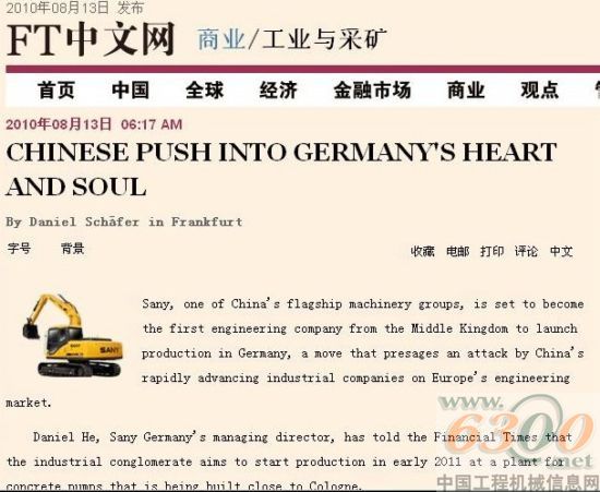 正在征服全球工程技术心脏地带——德国的三一集团,已经开始令德国同行们集体侧目!为全球130万读者提供全球顶尖商业财经资讯的世界级新闻机构——英国《金融时报》昨日报道,三一集团正在征服全球工程技术的心脏地带,这预示着中国快速发展的工业企业对欧洲工程市场发起了攻击。作为中国旗舰机械集团之一的三一集团正在科隆附近建造的混凝土泵厂计划于2011年初投产,三一集团即将成为中国首家在德国投产的工程公司。值得一提的是,这篇报道同时被挂到了FT中文网永利最大(官方)网站首屏的主BANNER位置。据悉,这是中国工程机械企业第一次受到国际权威财经媒体如此“特别”的关注。