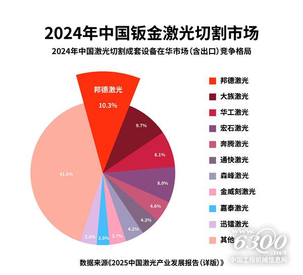 激光切割设备分为钣金激光切割设备和精密激光切割设备。精密激光切割市场虽然刚刚起步,整体规模尚不及钣金激光切割,但潜力巨大、成长空间显著;而钣金切割市场则呈现明显两极分化态势。从整体竞争格局来看,前十强企业合计占据超过50%的市场份额。其中,邦德激光以10.3%的市占率再度蝉联中国市场第一,连续两年稳居行业榜首。据记者调查,该企业坚持技术自研与产品创新,实现了激光器、激光头、操作系统等关键部件的自主研发,并推出多款集成超高功率、全自动与智能化功能的高端机型,赢得市场广泛认可。